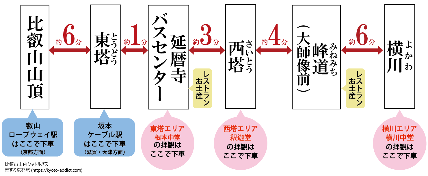 「比叡山山内シャトルバス」のバス停は6つで、各区間の乗車時間は上の図の通りです。