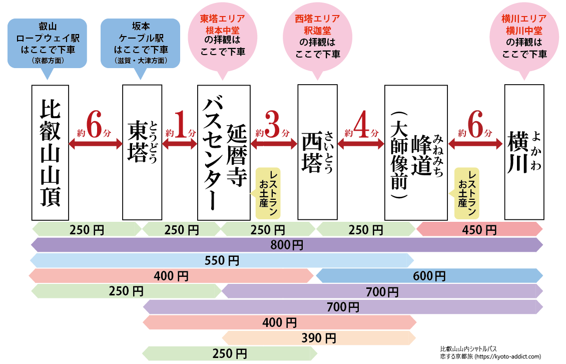 2.比叡山山頂⇔西塔 | 400円 | 叡山ロープウェイ「比叡山頂」駅の最寄り⇔西塔エリア入口の最寄り |