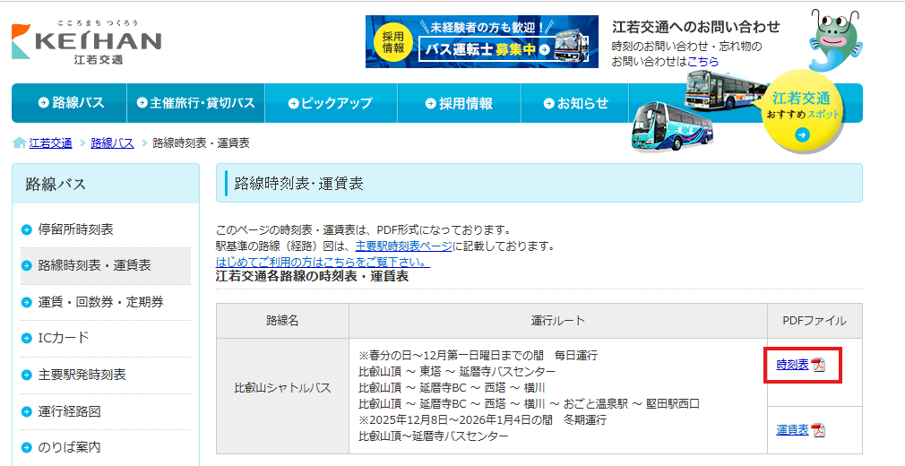 ⇒サイト内の比叡山山内シャトルバス(比叡山シャトルバス)のPDFを確認
