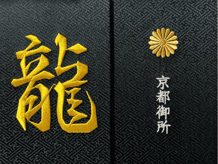 羽を広げた鳳凰に囲まれたピンクの部分は菊紋、桜、松などがデザインさせています。