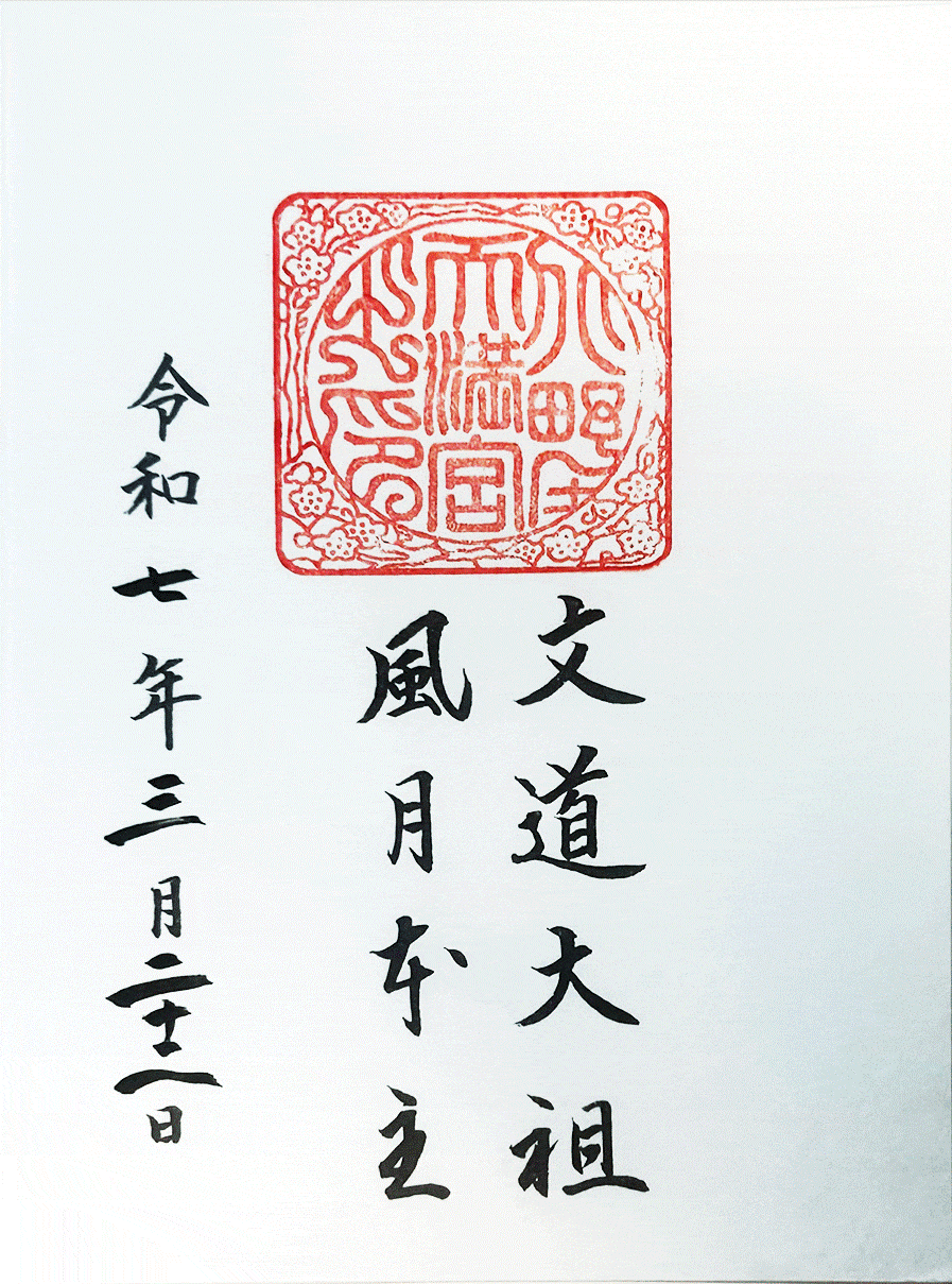 平安時代中期の学者・ 慶滋保胤(よししげのやすたね)・大江匡衡(おおえのまさひら)が「学問・芸能・詩歌」に秀でた菅原道真公を称賛した言葉。「文道大祖」は学問・文学の祖、「風月本主」は漢詩・和歌に長じた人という意味。