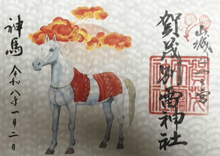 こちらは上賀茂神社の神馬「神山号」がモチーフの御朱印です。毎年1月7日に行われる白馬奏覧神事の装いが描かれています。