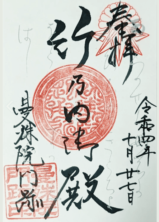 | 墨文字 | 右列:奉拝 和暦〇年〇月〇日 中央:竹乃内御殿 左列:曼殊院門跡 |