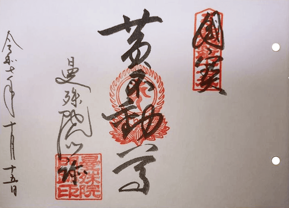 御朱印 | 右列:梵字、近畿十七番 中央:梵字印(カーン) 左列:曼殊院門跡印 |