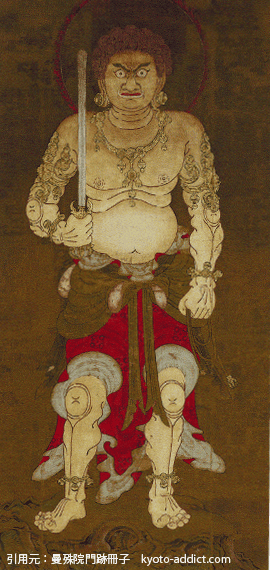 曼殊院門跡の国宝・黄不動は、三井寺が所有する国宝「絹本著色・不動明王像(黄不動尊)」の模写なのですが、模写の中では最も古く、絵画表現上の秀逸さから国宝に指定されているというちょっと珍しい国宝です。