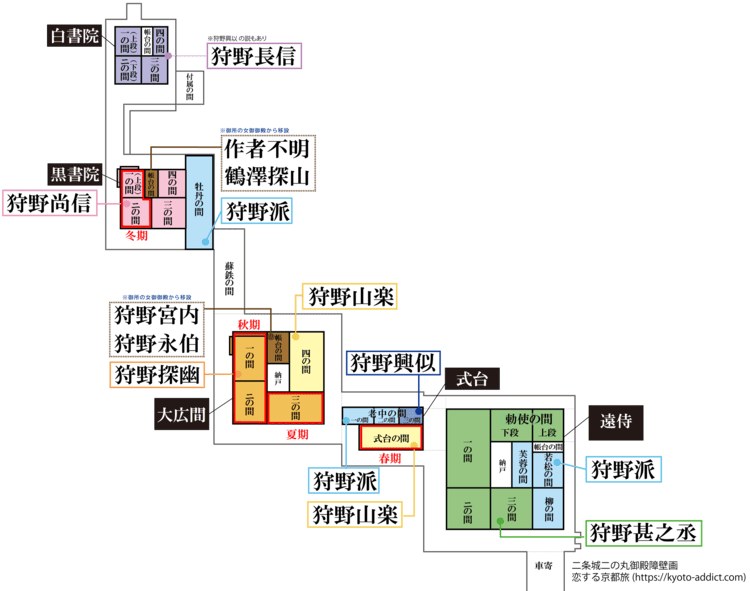 二条城障壁画 展示収蔵館には二の丸御殿障壁画の原画(本物)の一部が展示されるのですが、各部屋の作者と作品名、題材なのどをまとめたのが上の図です。