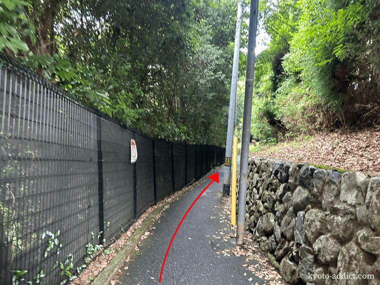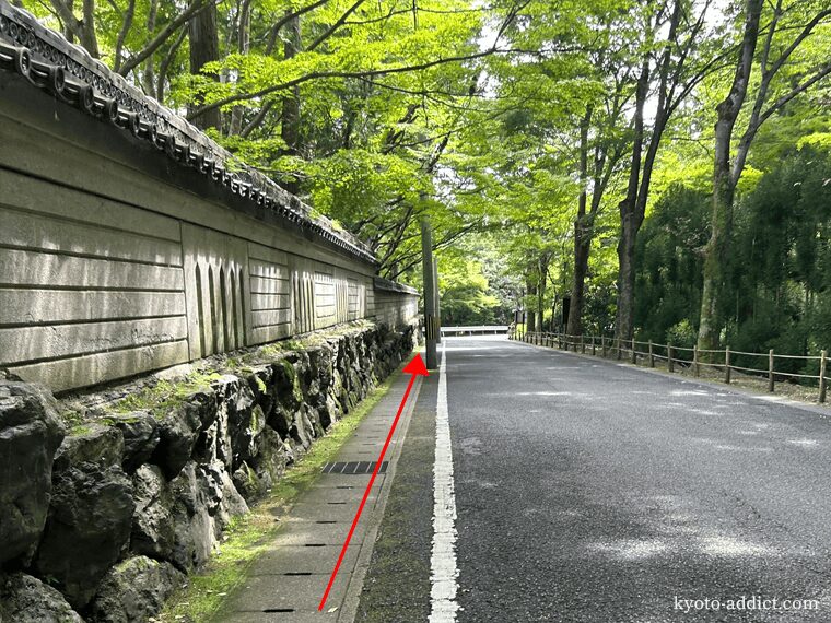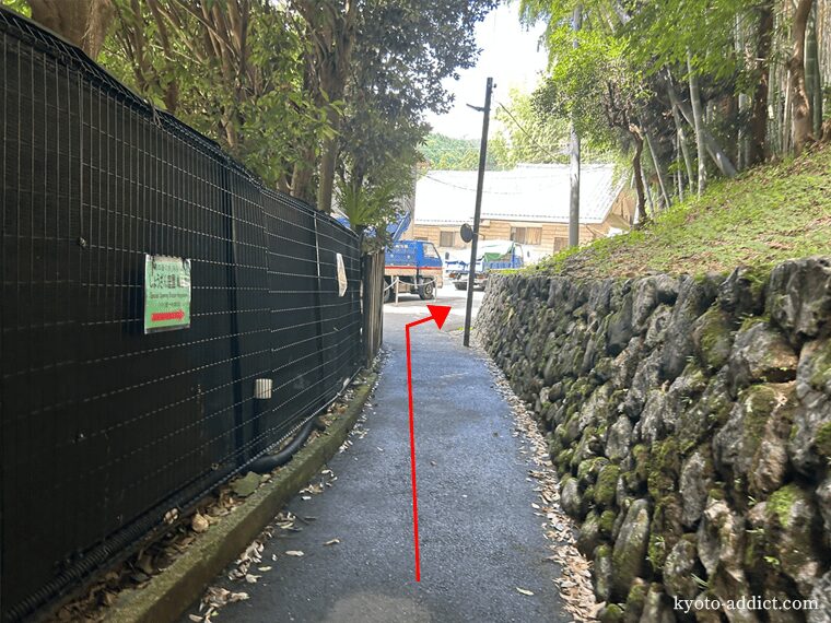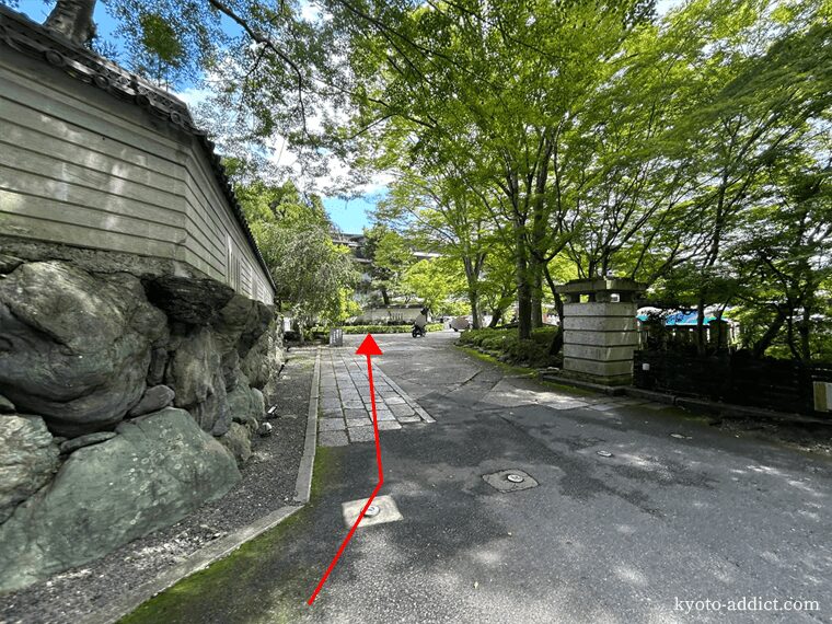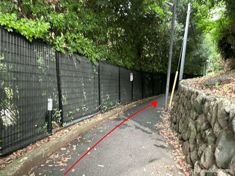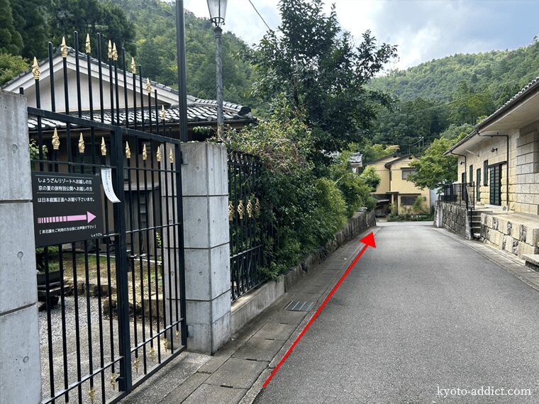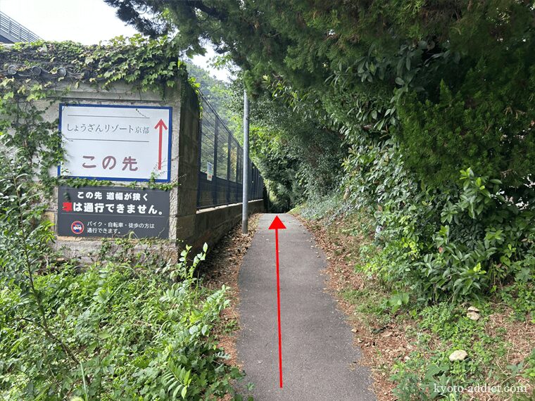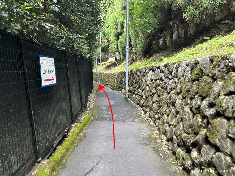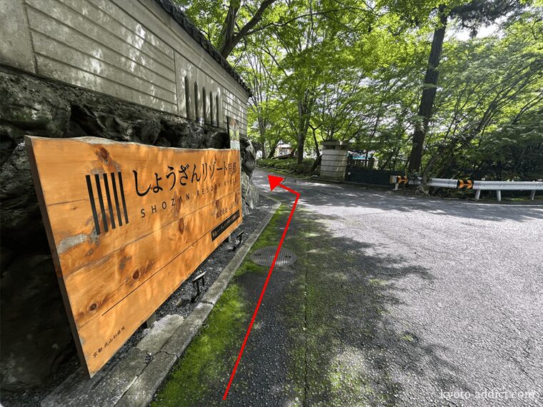 まっすぐ進んでいくと最後に壁が左側にカーブするので、それに沿って歩くと「しょうざんリゾート京都」の看板が見えてきます。壁に沿って進んだ先が「西門」です。