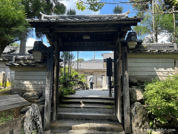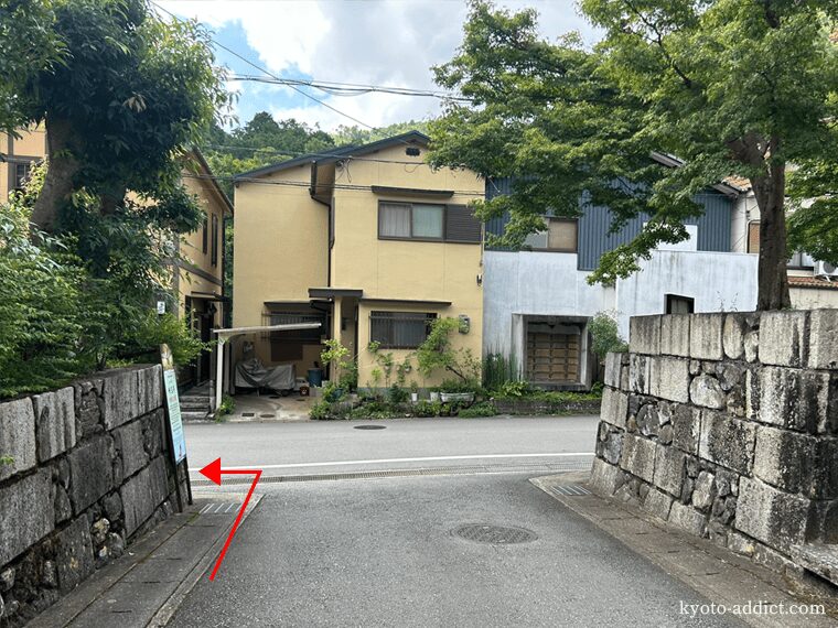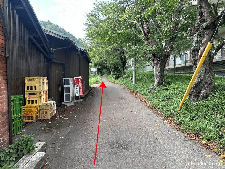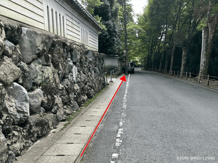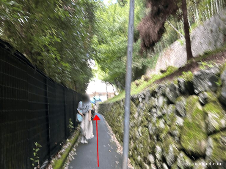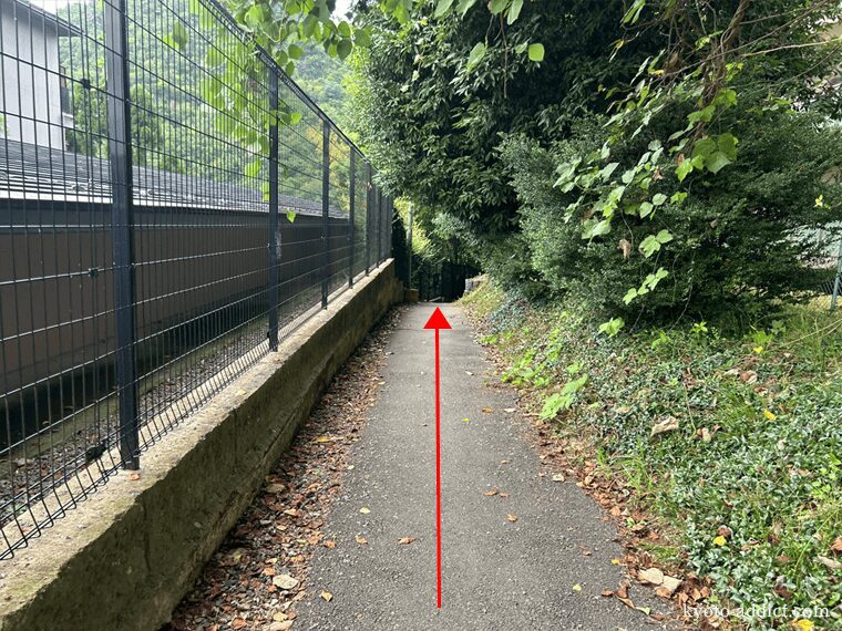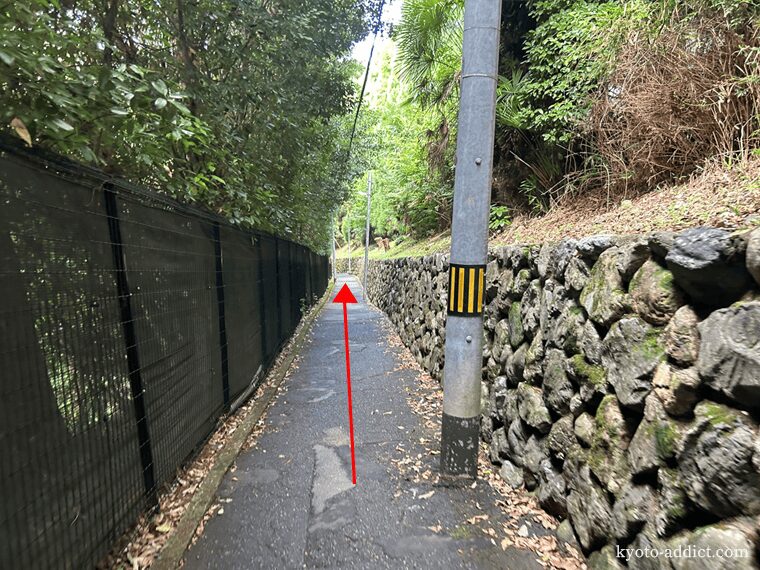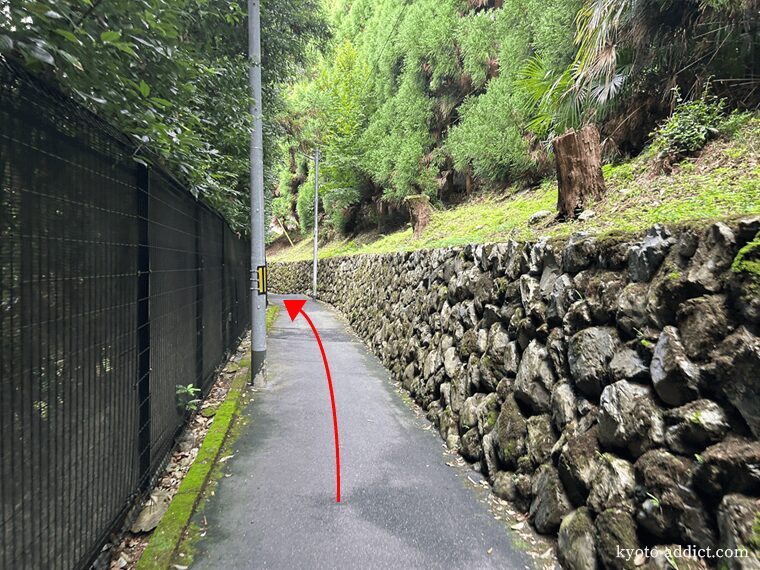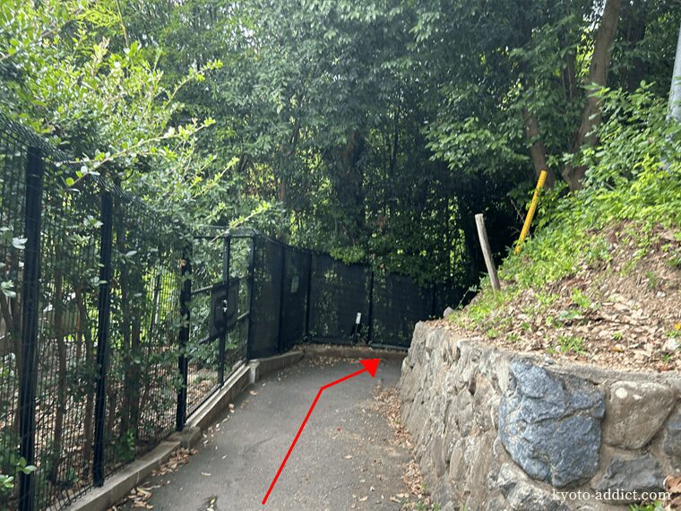 まっすぐ進んでいくと最後に壁が左側にカーブするので、それに沿って歩くと「しょうざんリゾート京都」の看板が見えてきます。壁に沿って進んだ先が「西門」です。