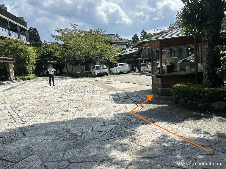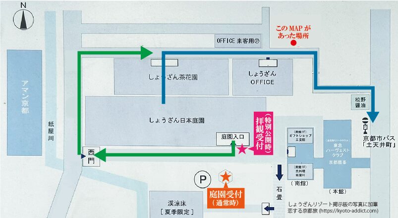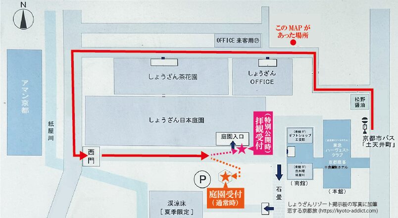 バス停としょうざん庭園の間に会員制ホテル「東急ハーベストクラブ京都鷹峯&VILAホテル」があるため、宿泊者以外はバス停からぐるっと大回りして受付に向かう必要があります。(上記の赤い矢印ルート)