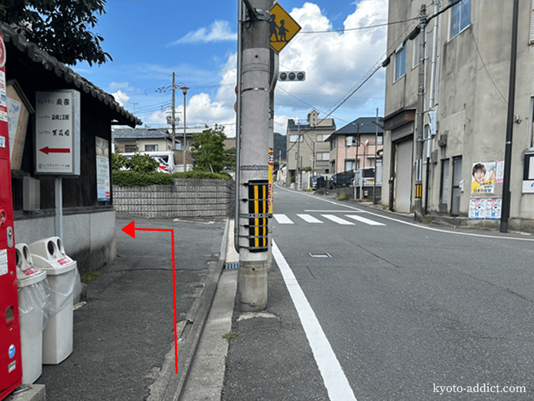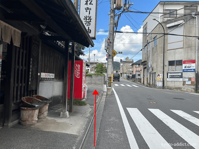 「松野醤油」の建物の切れめで左に曲がります。↑(京の夏の旅などで峰玉亭の特別公開がある期間は建物の角に道案内のポスターが貼られます)