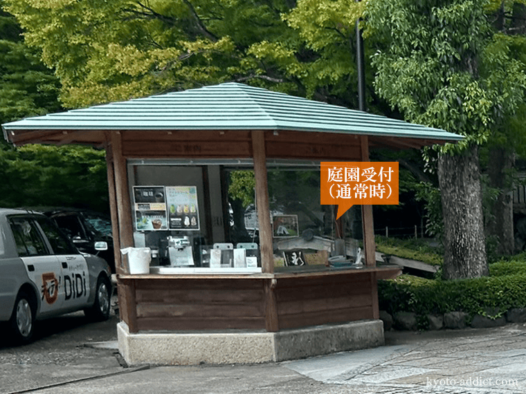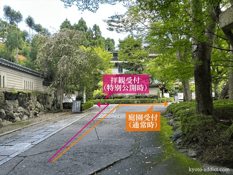 京の夏の旅で公開されるときは左の庭園に直接向い、それ以外の時は庭園入口前を右に曲がって「庭園受付」に向かいます。