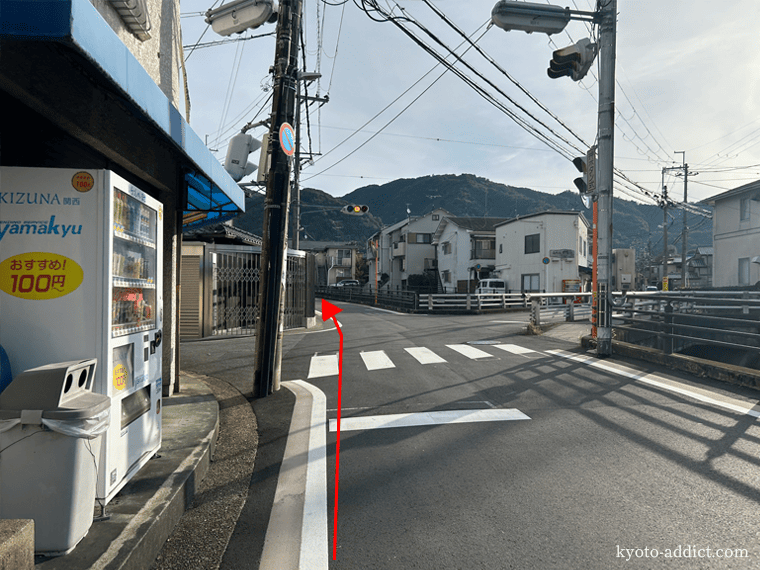 ↓道の突き当り正面の横断歩道まで進みます。(左側にも横断歩道がありますが正面の方を渡るのがポイント)