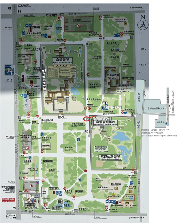 こちらのマップの★2の場所が仙洞御所の受付です。