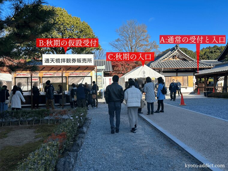 拝観受付 | ■通常期拝観料(秋季期間以外) 回廊横の建物(上の写真のA) ■秋季拝観料:11月15日〜12月7日 回廊横の仮設受付(上の写真のA) |