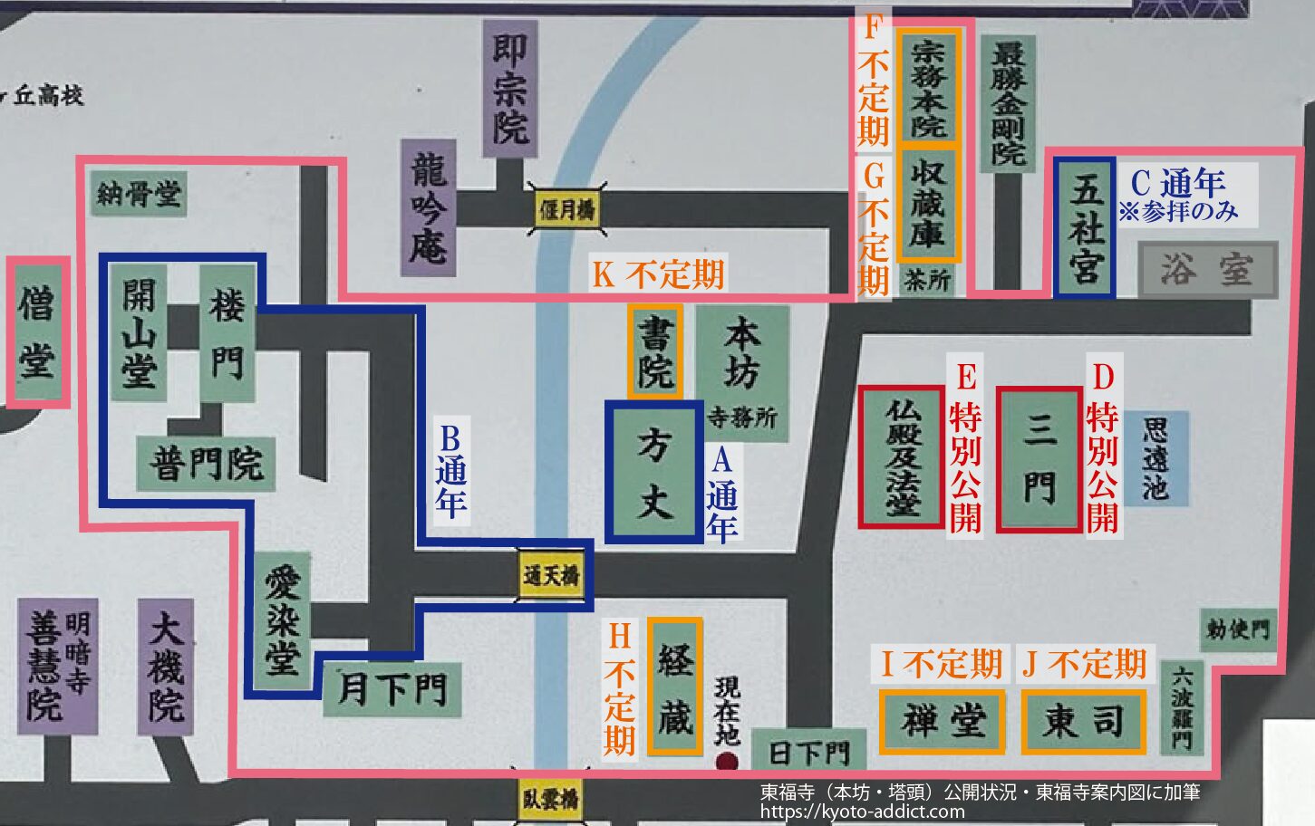F.宗務本院(大慧殿) G.収蔵庫(光明宝殿) H.経蔵 I.禅堂 J.東司 K.書院 ※G~Jは京の冬の旅で公開された履歴あり、KはJR東海ツアーズの特別公開の履歴あり ※Fは華道展などが行われる期間に中に入れる ※Iは日曜坐禅会で中に入れる ※G・Iは東福寺のプレミアムツアー(東福寺の至宝巡り)の対象 |